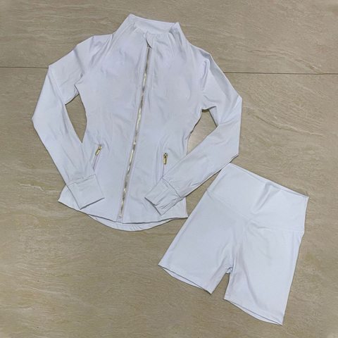 Giacca da donna con cerniera in due pezzi da palestra in Nylon bianco oro con foro per il pollice Pantaloncini da Yoga da 4 pollici con motivo solido