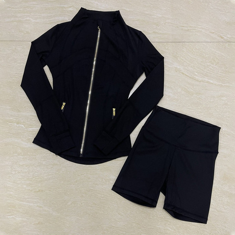 2025 Nieuwkomer Yoga-Trainingspak Voor Dames, Ademend, Effen Patroon, 2-delige Set Met Gouden Jack En Korte Broek Met Rits