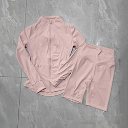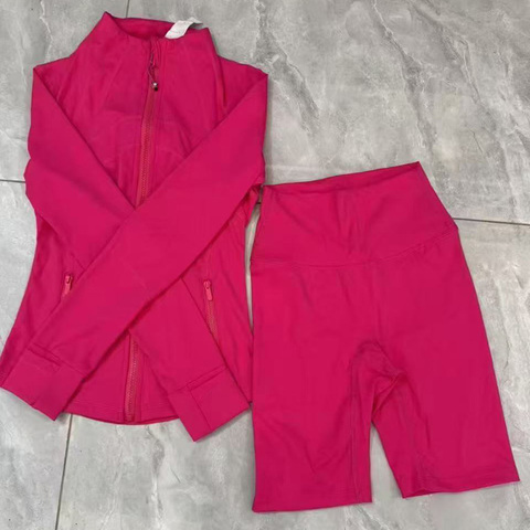 2025 yeni varış kadın Yoga spor eşofman nefes katı desen 2-Piece altın fermuarlı ceket ve şort ile Set